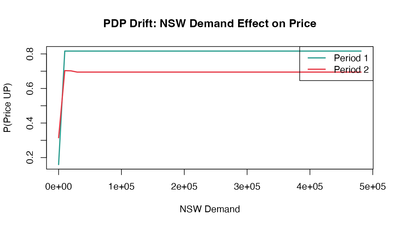 #> 3 L2_derivative 0.0005Higher distance indicates the model learned different demand-price relationships in each period—concept drift detected.